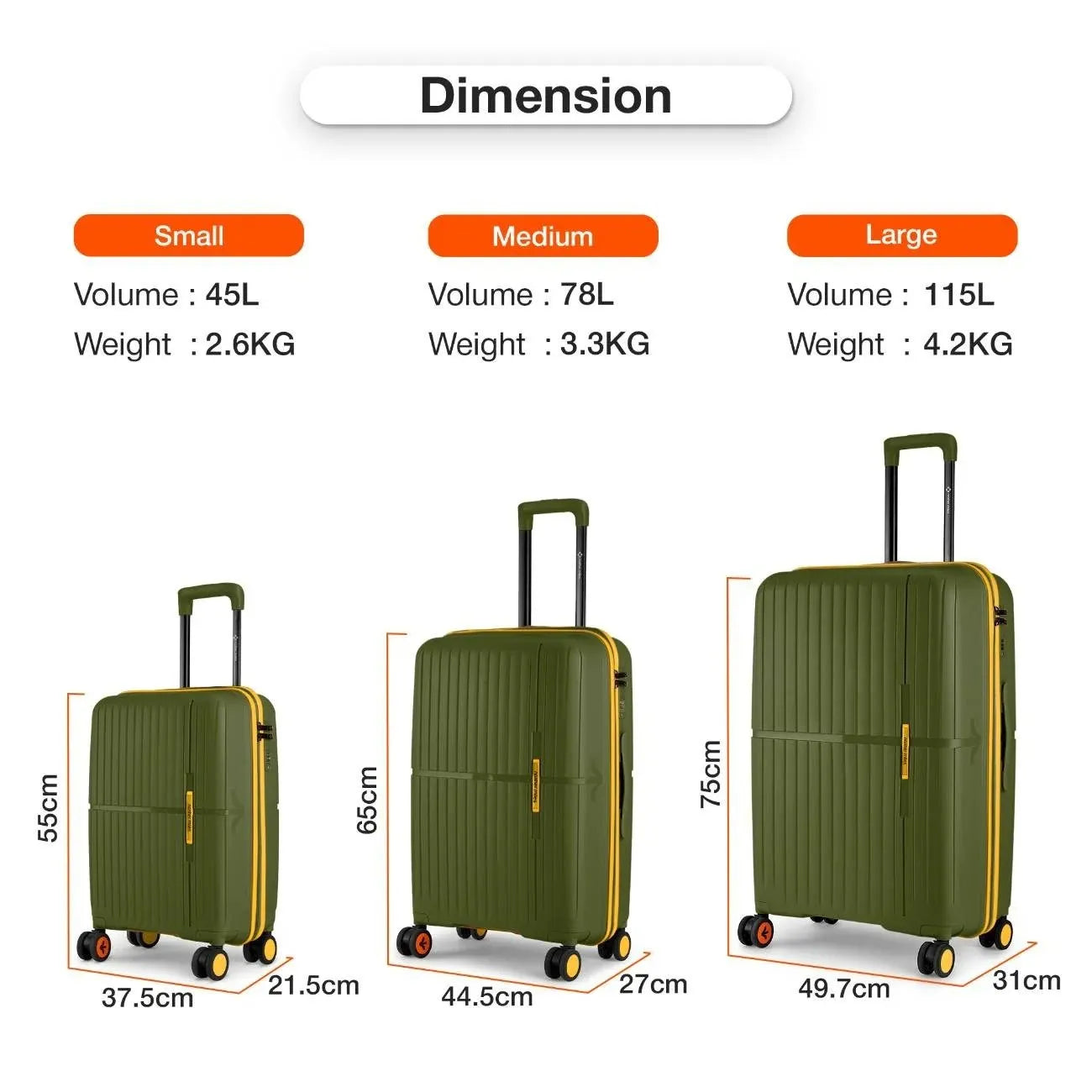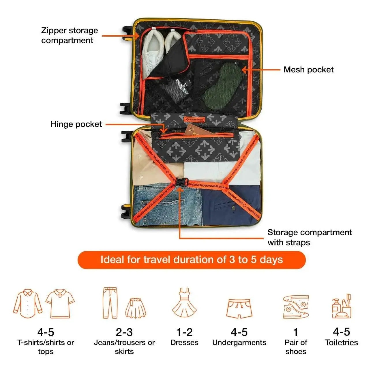 Carry-On Small (S): With a compact 20-inch size, this carry-on suitcase is ideal for travel duration ranging from 1 to 5 days, making it the perfect companion for weekend getaways, business trips, or quick vacations. Suitcase can hold weight up to 8 Kg.