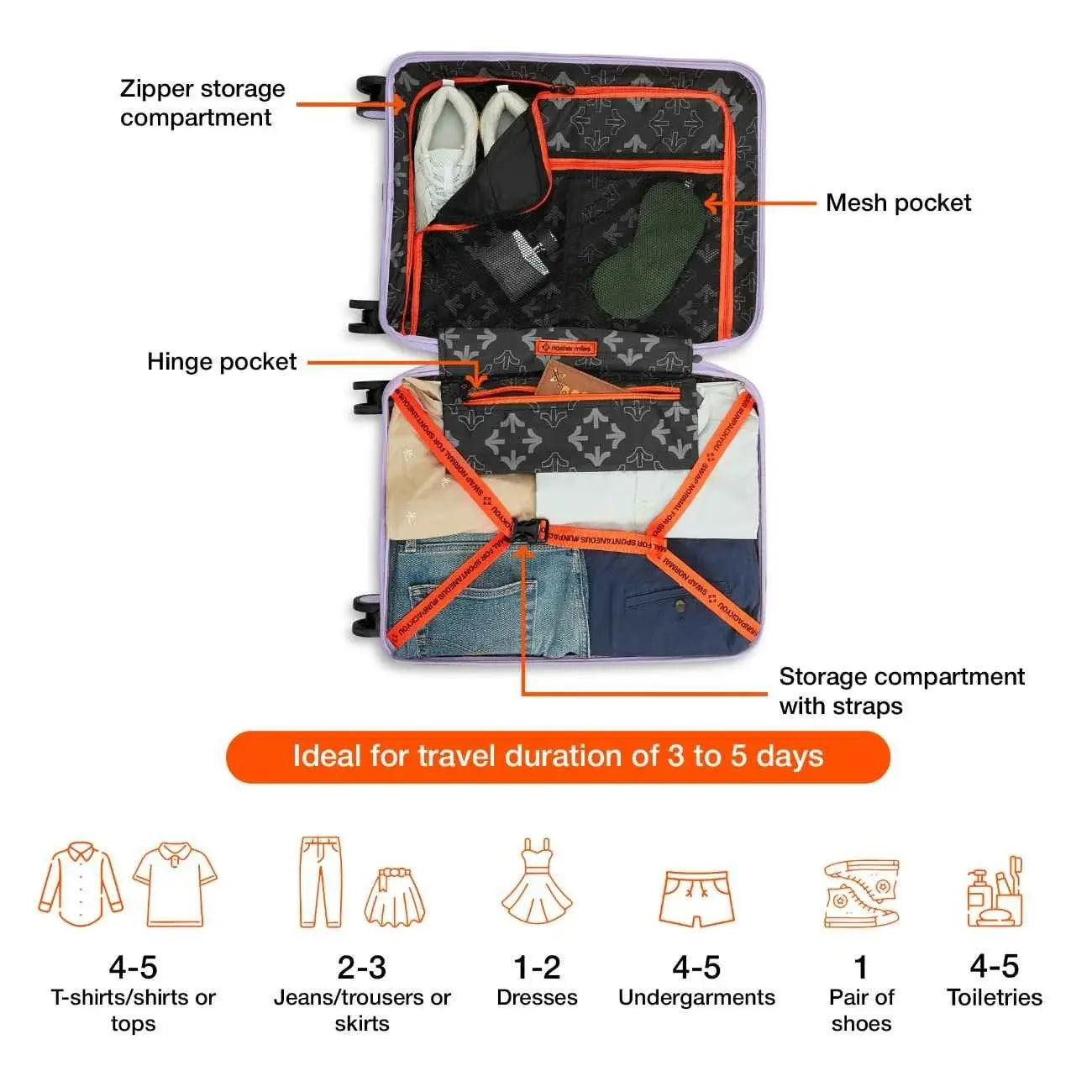 Secure Number Lock: Enjoy worry-free travels with the built-in number lock on the Nasher Miles luggage. This feature provides enhanced security, allowing you to keep your belongings protected and giving you peace of mind throughout your journey.