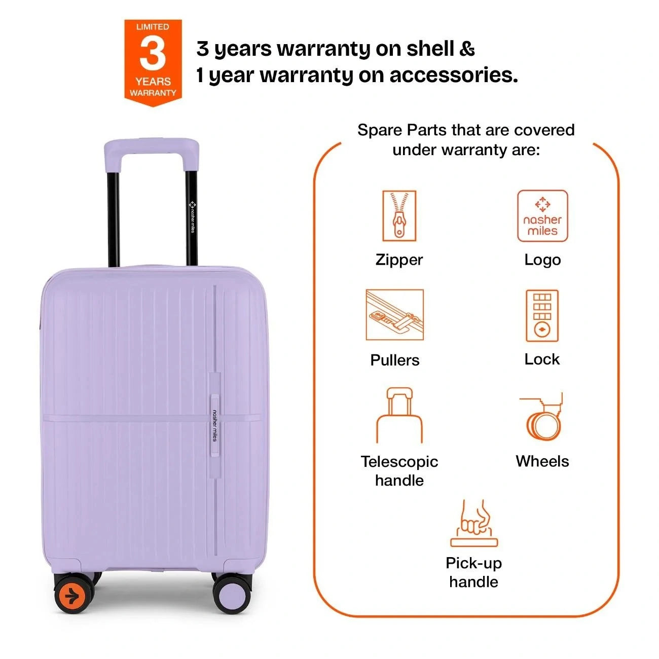3 Years warranty on shell & 1 year warranty on accessories. Wear & Tear for product under use and scratches are not covered.
