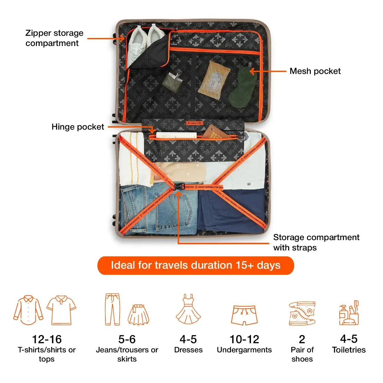 Organized Interior: Includes 2 spacious compartments along with 2 mesh pockets and a hinged pocket inside. This facilitates effortless and convenient packing, ensuring your essentials stay neatly organized while you travel.