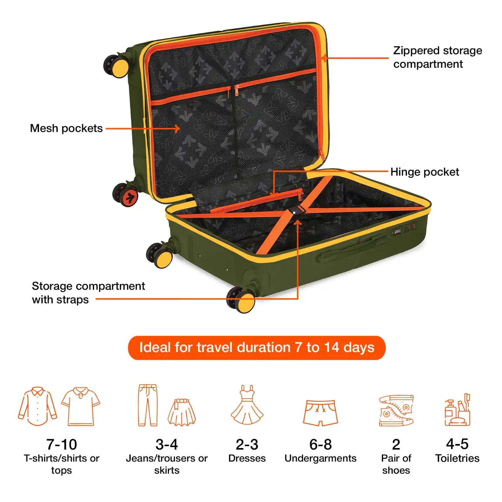 Check-In Medium (M): With a 24-inch size, this check-in suitcase is ideal for travel duration ranging from 5-7 days, making it the perfect companion for weekend getaways, business trips, or vacations. Suitcase can hold weight up to 15 Kg.
