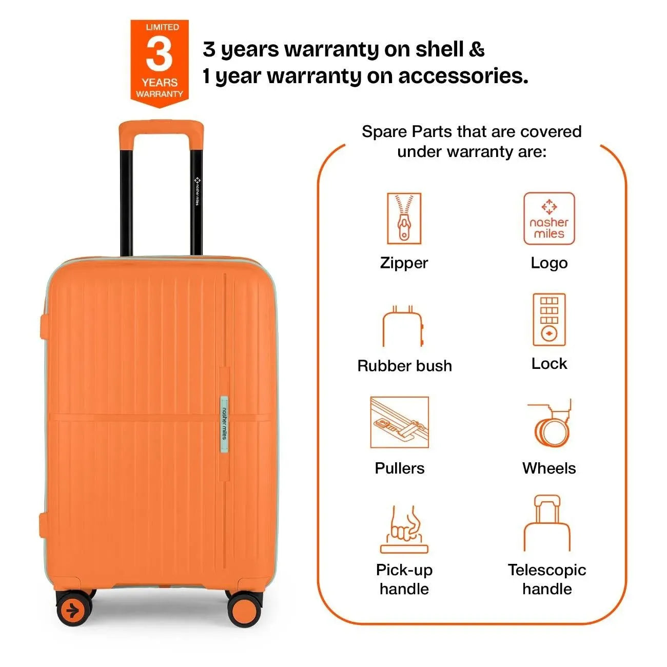 3 Years warranty on shell & 1 year warranty on accessories. Wear & Tear for product under use and scratches are not covered.