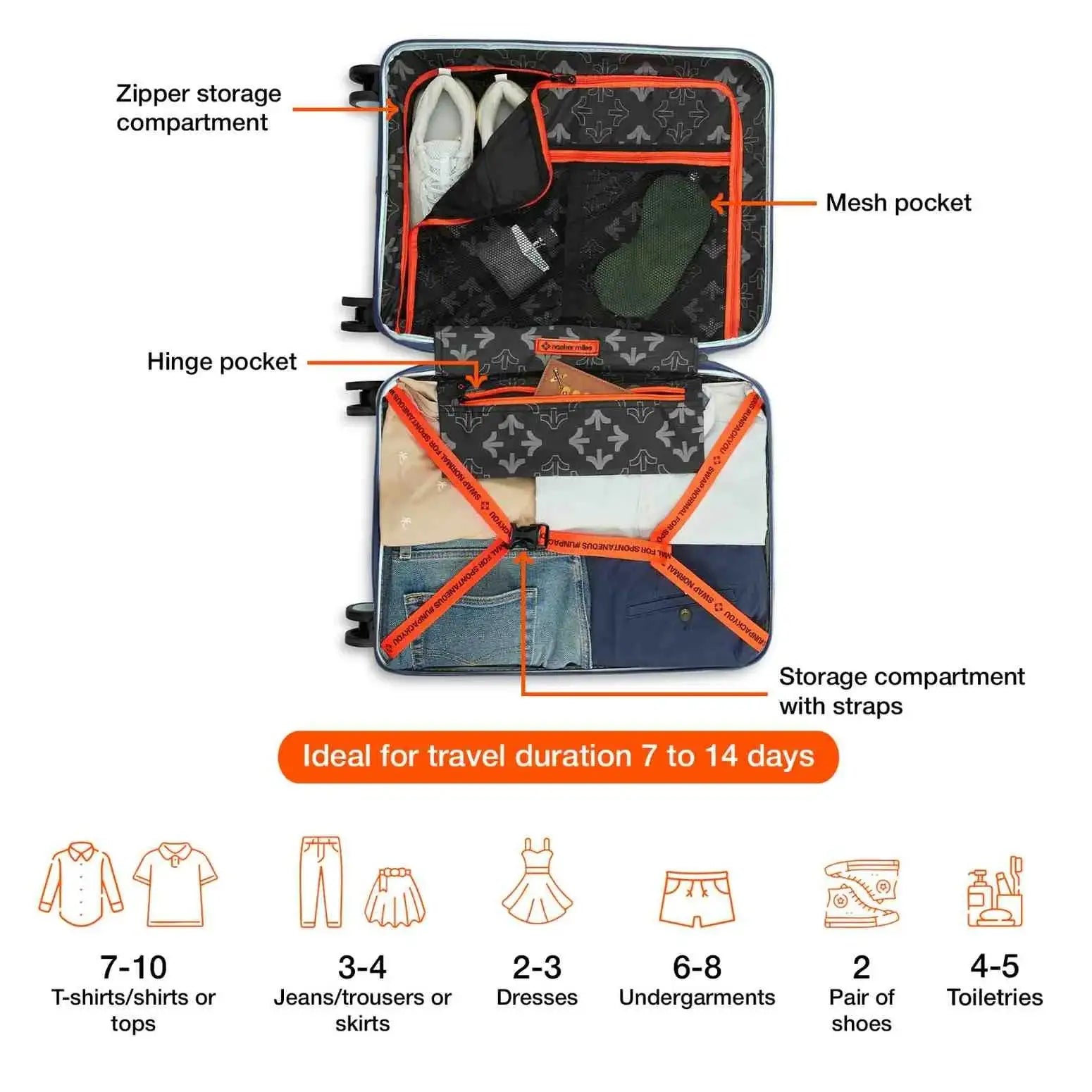 Check-In Medium (M): With a 24-inch size, this check-in suitcase is ideal for travel duration ranging from 5-7 days, making it the perfect companion for weekend getaways, business trips, or vacations. Suitcase can hold weight up to 15 Kg.