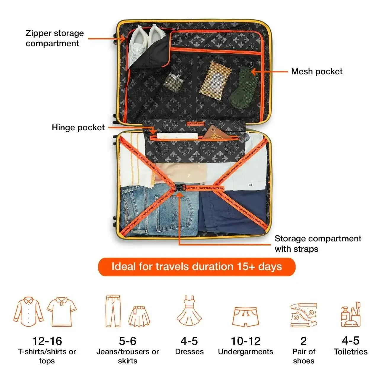 Spacious Interiors: Compact yet spacious, our trolley bag features dual-sided interior storage. One side comes with adjustable straps and the other one is a zippered section to keep your clothes, accessories and electronics neatly organized. Each bag has a separate number lock (reset code 0-0-0)