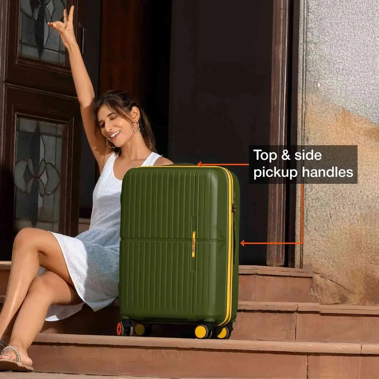 Effortless Travel: Experience smooth and effortless maneuverability with eight 360-degree spinning wheels, allowing you to glide through airports, train stations and hotel lobbies with ease. Features easy-grab handle on the top and sides.