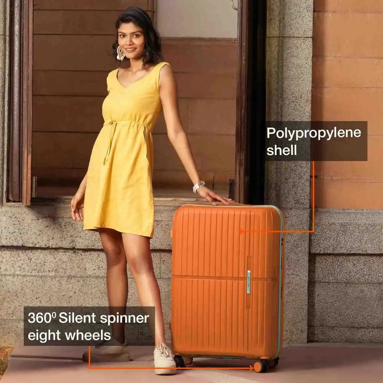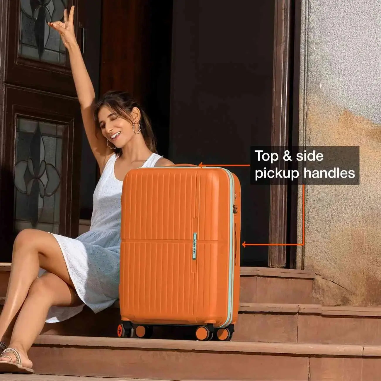 Effortless Manoeuvrability: with Matching Accessories: Designed with 8 multi-directional wheels that allow your suitcase to glide alongside you effortlessly and a telescopic handle for smooth mobility. Includes a convenient top pick-up handle across all sizes and an additional side pickup handle in check-in luggage for easy lifting and carrying. Complete with matching accessories for a coordinated and functional travel experience.