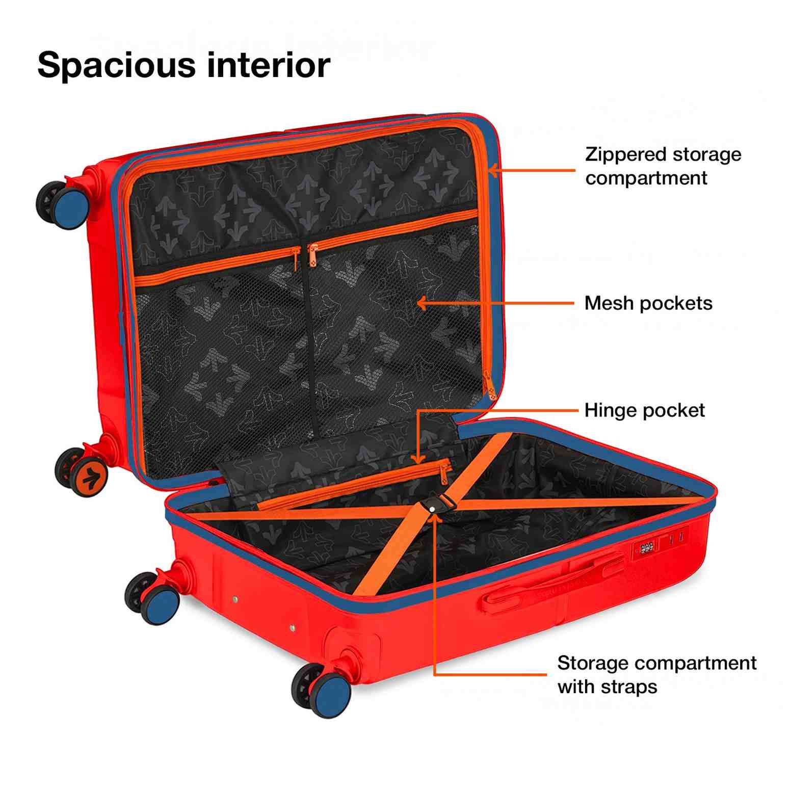 Spacious Interiors: Compact yet spacious, our trolley bag features dual-sided interior storage. One side comes with adjustable straps and the other one is a zippered section to keep your clothes, accessories and electronics neatly organized. Each bag has a separate number lock (reset code 0-0-0)