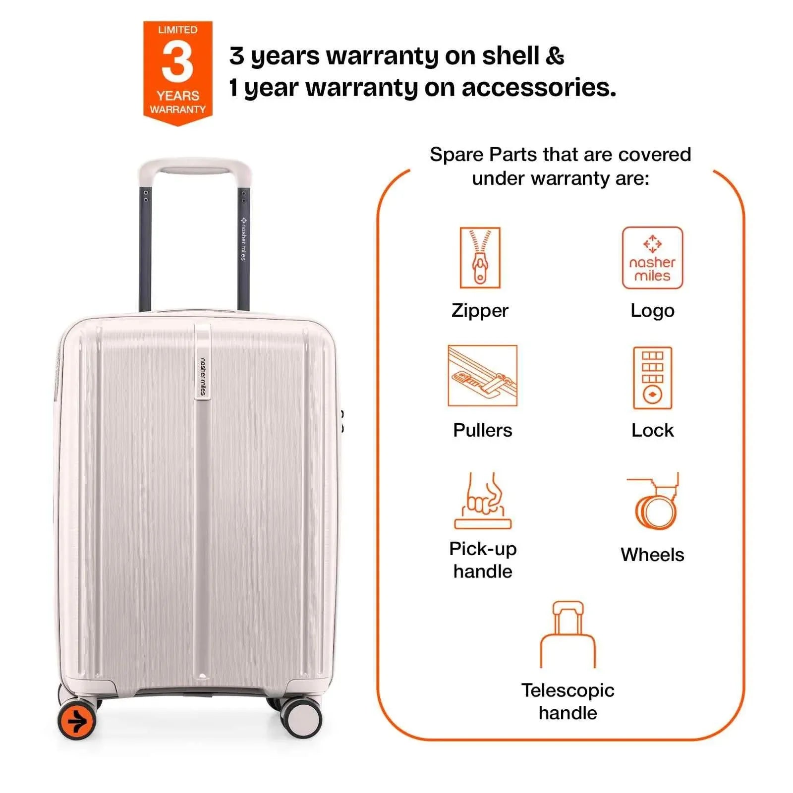 3 Years warranty on shell & 1 year warranty on accessories. Wear & Tear for product under use and scratches are not covered.