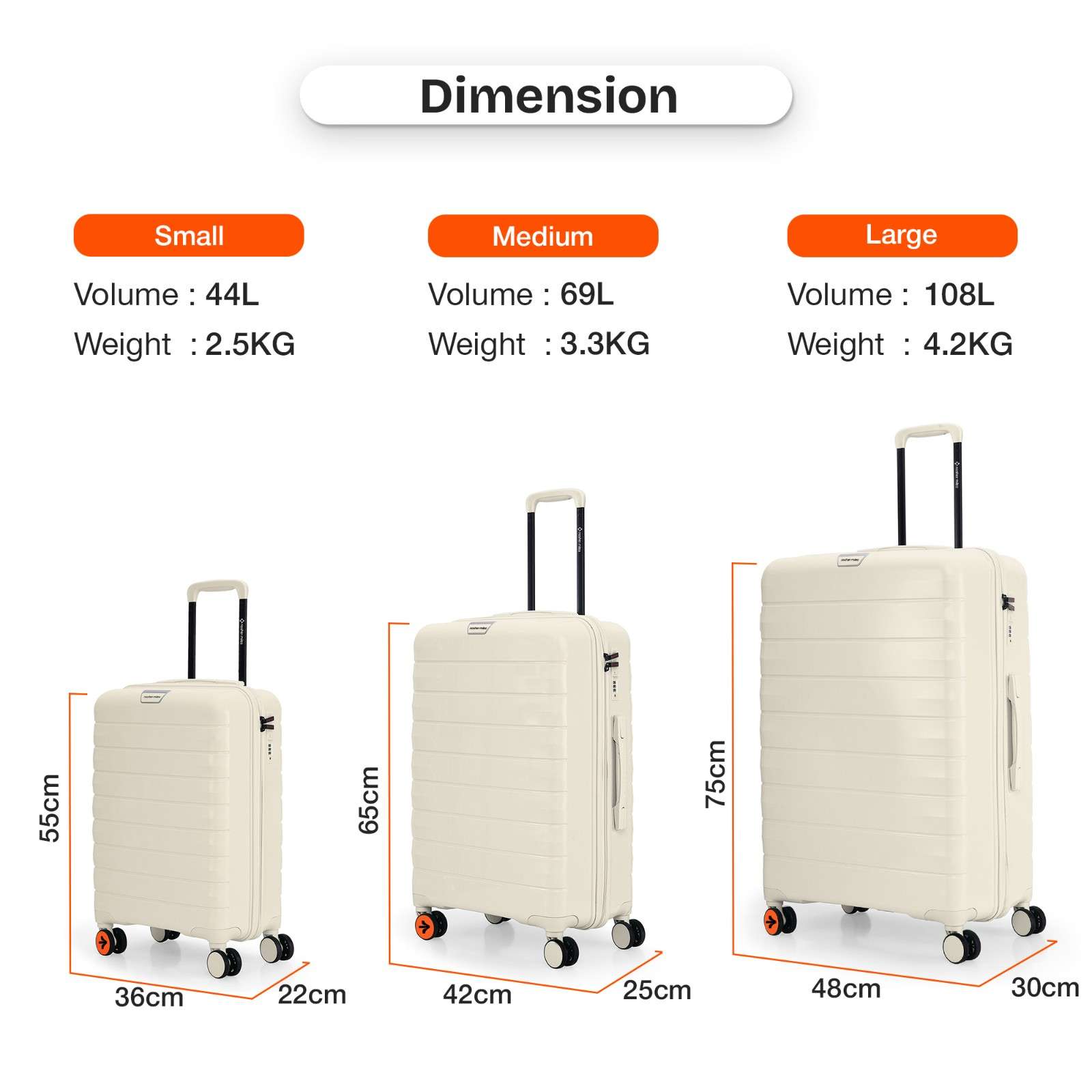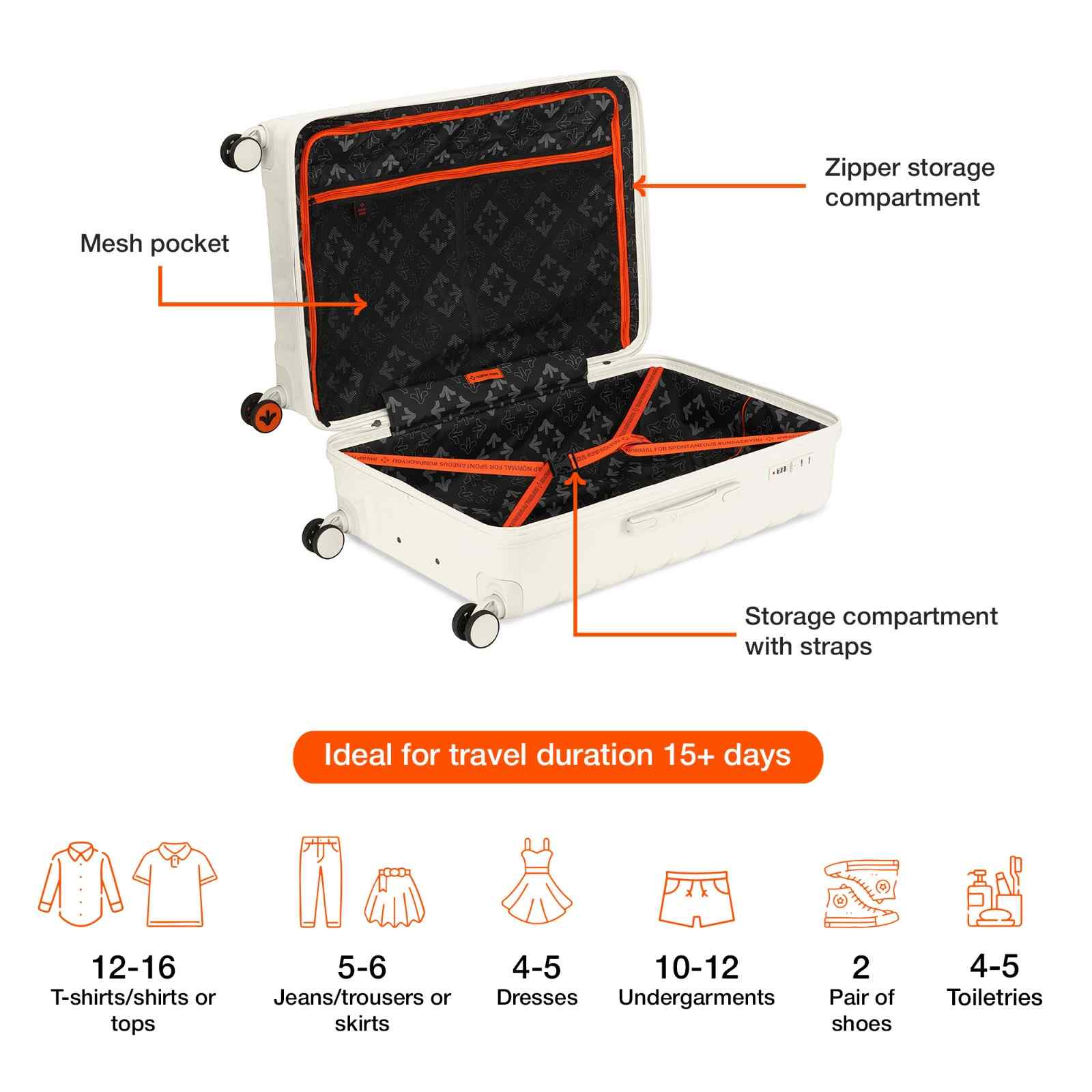 Check-In Large (L): With a 28-inch size, this check-in suitcase is ideal for travel duration lasting than a week, making it the perfect companion for weekend getaways, business trips, or vacations. Suitcase can hold weight up to 20 Kg.