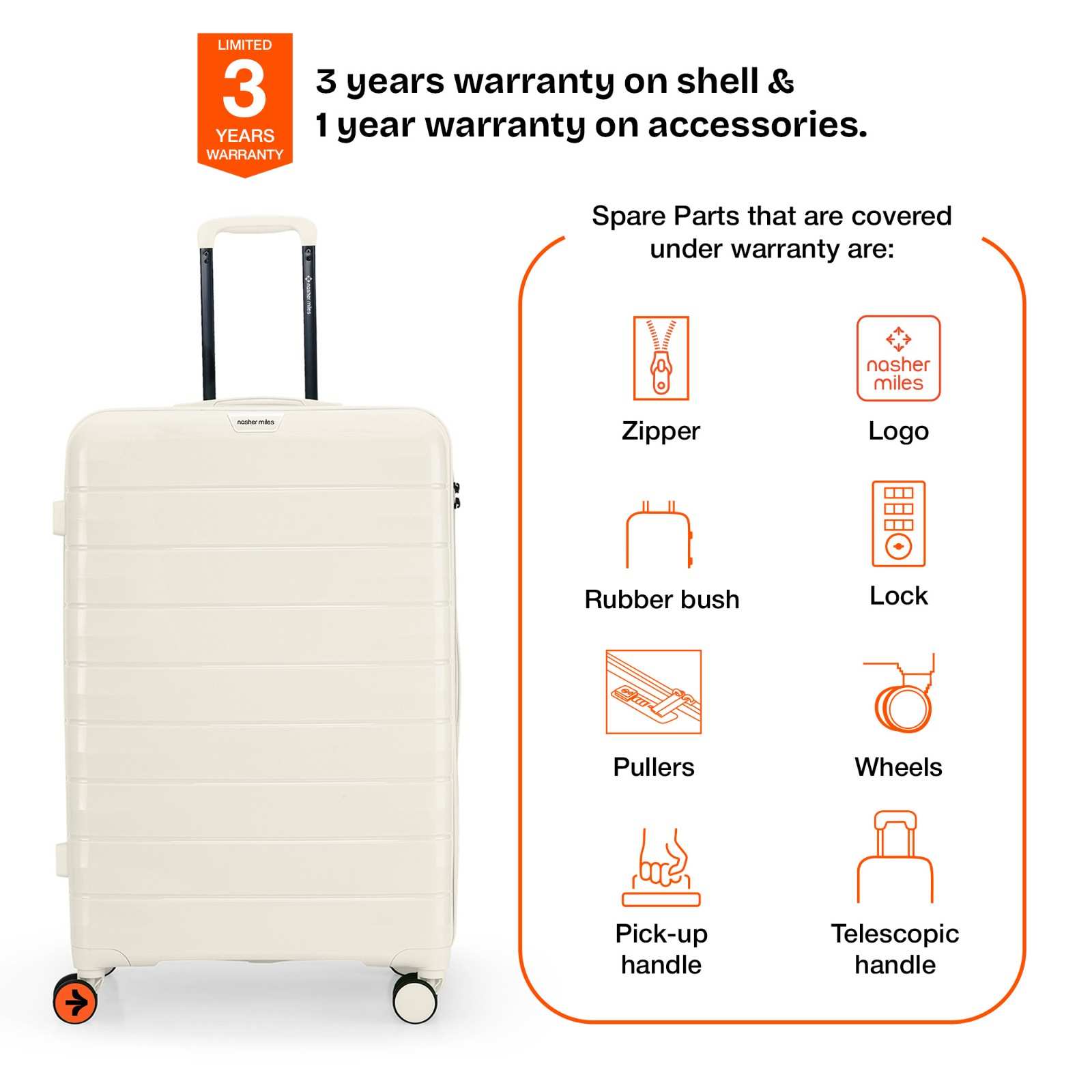 3 Years warranty on shell & 1 year warranty on accessories. Wear & Tear for product under use and scratches are not covered.